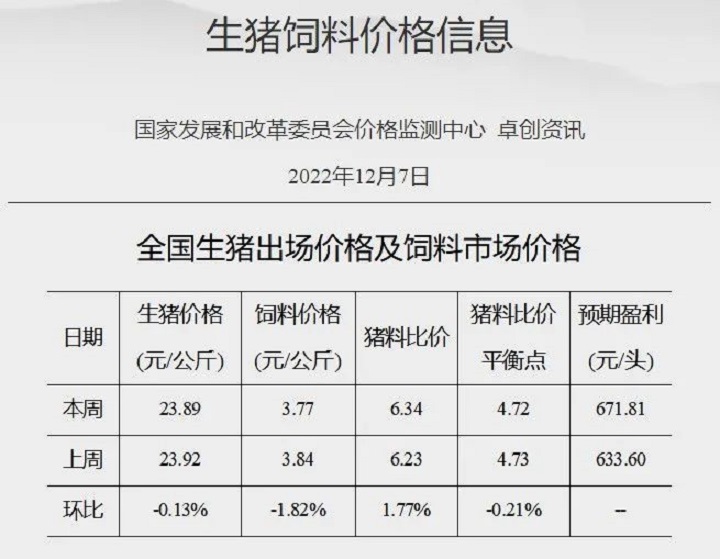 國家發展和改革委員會價格監測中心監測,2022年12月第1周全國豬料比價為6.34,環比上漲1.77%。按目前價格及成本推算,未來生豬養殖頭均盈利為671.81元。本周國內豬價呈先漲后跌走勢。