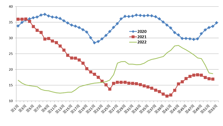 2020-2022年生豬周價(jià)格走勢(shì)(元/公斤)