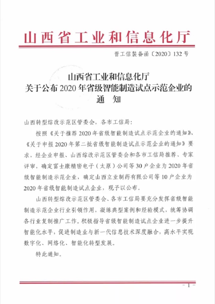 【喜訊】大禹生物榮獲山西省2020年省級(jí)智能制造示范企業(yè)榮譽(yù)稱號(hào)
