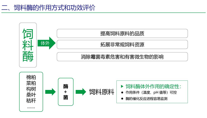 飼料酶在體內可以補充幼齡動物內源酶不足、消除抗營養因子、提高飼料轉化效率、節約飼料資源、減少有機物排放,保護環境、消除體內霉菌毒素危害和有害微生物的影響。
